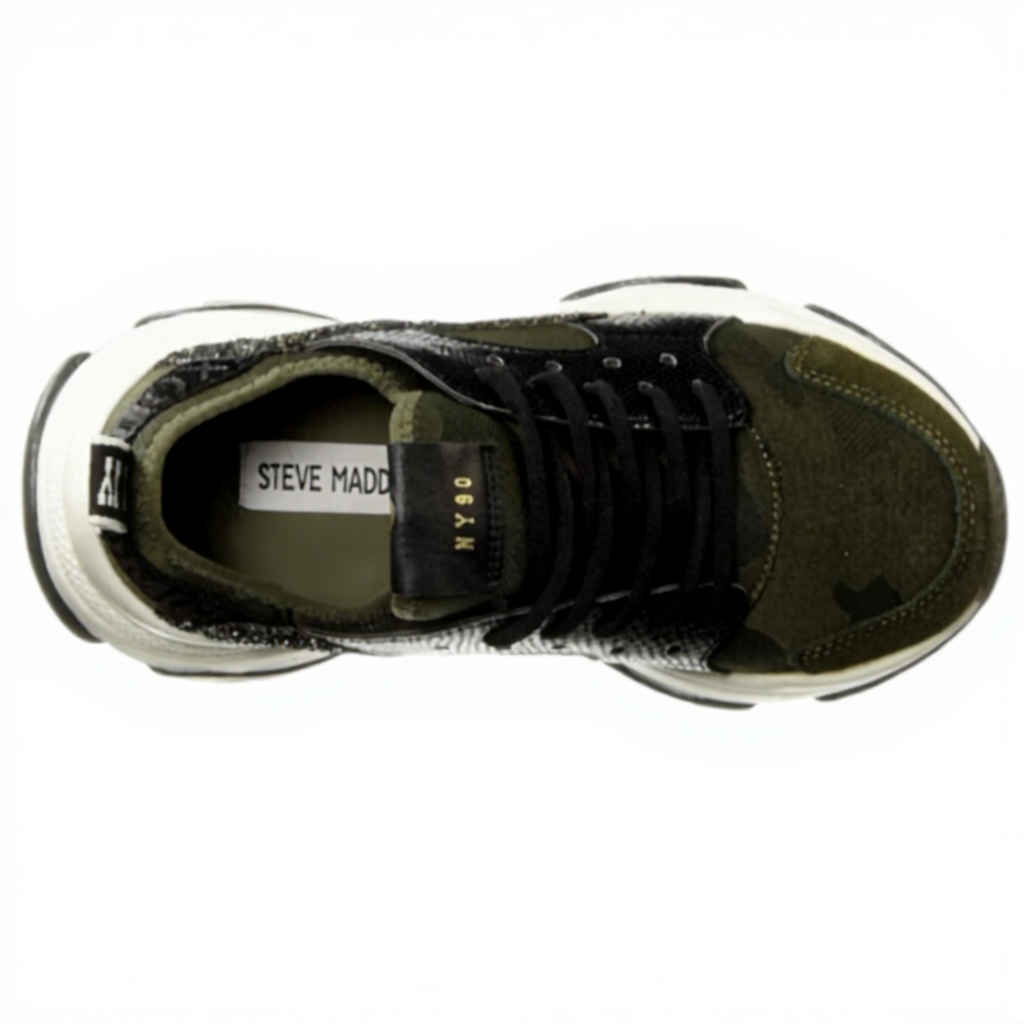 Ces baskets Steve Madden se distinguent par leur design unique associant tissu et cuir avec des finitions pailletées. Leur couleur vert olive apporte une touche moderne et versatile, tandis que le matériau principal en polyester assure légèreté et respirabilité. Idéales pour un look décontracté mais soigné, elles offrent un excellent maintien grâce à leur construction robuste.