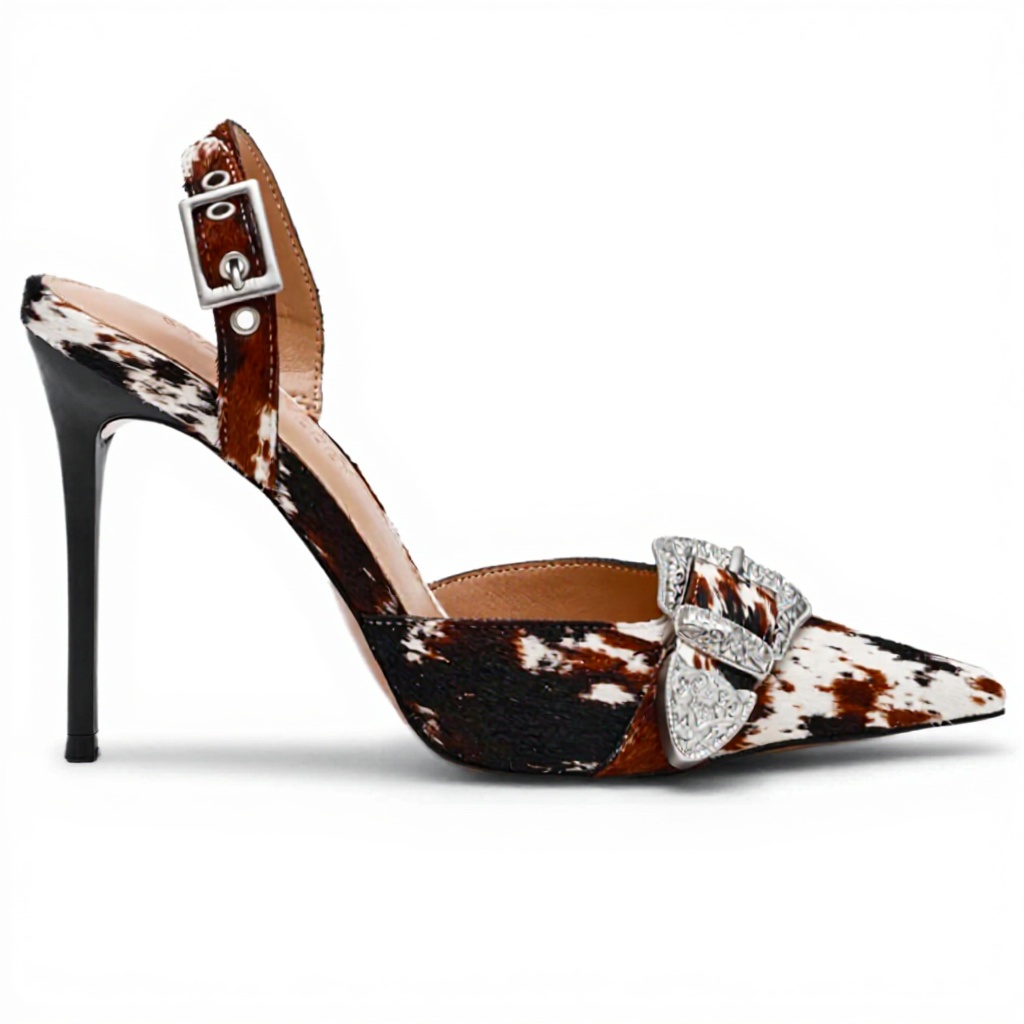 Les escarpins Delilah sont proposés en tailles EU 36, 37, 38, 39 et 40, avec des coloris Blanc Vieilli et Imprimé Vache pour s’adapter à différentes préférences.