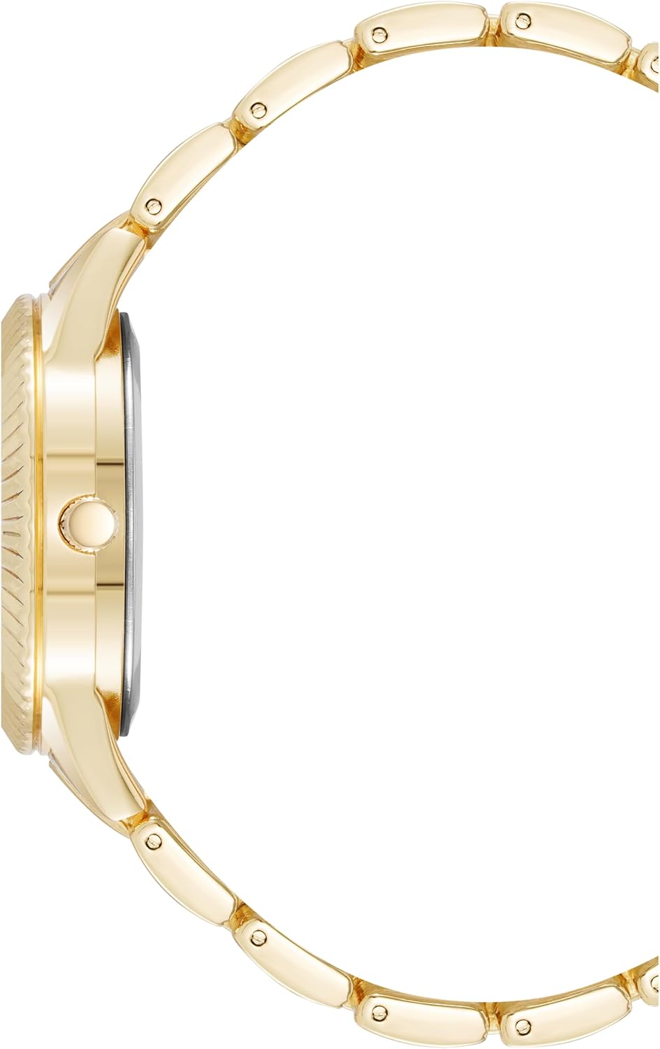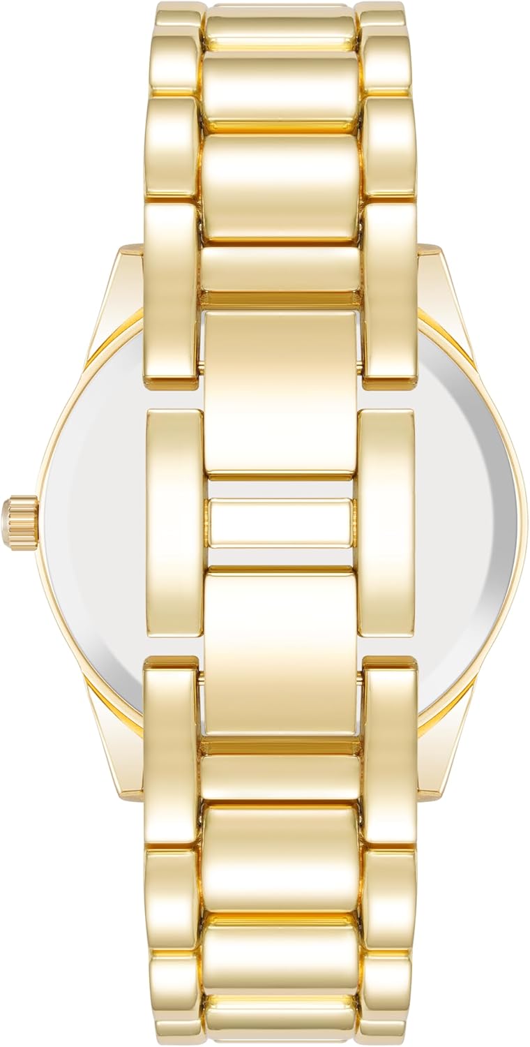 Cette montre bracelet Steve Madden se distingue par sa lunette texturée et son verre en cristal minéral résistant. Le cadran vert soleil est agrémenté d’aiguilles blanches dorées et de marqueurs en cristaux véritables, avec une piste extérieure noire pour les minutes. Le bracelet à maillons réglables en or, doté d’un fermoir et d’une extension de bijoux, assure un ajustement personnalisé et un style raffiné.