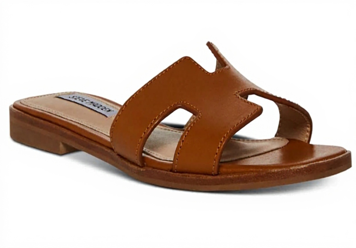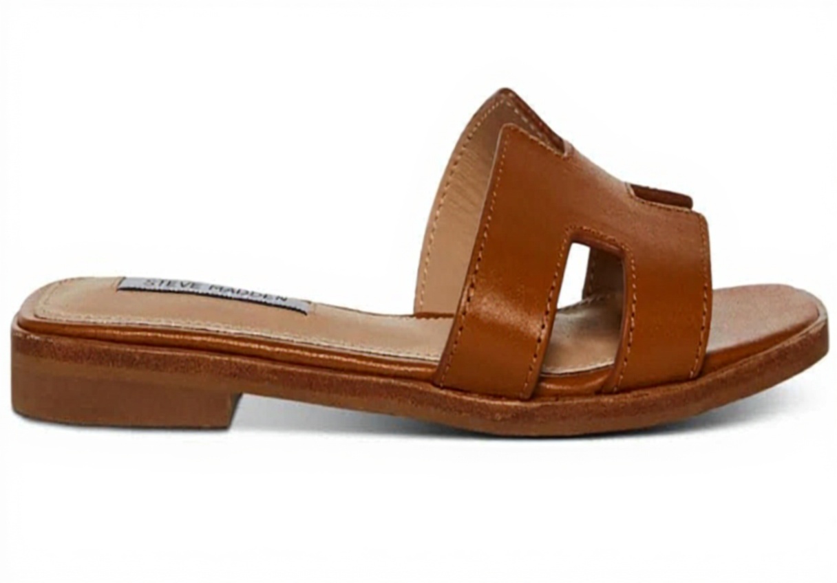 Ces sandales plates Steve Madden se distinguent par leur design géométrique raffiné avec une sangle unique ornée de détails découpés au laser. Confectionnées en cuir cognac de qualité supérieure, elles allient élégance moderne et durabilité grâce à leur construction soignée et leurs matériaux sélectionnés.
